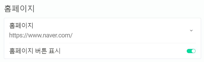 2. 홈페이지 > 페이지 url 입력 > '홈페이지 버튼 표시' 켜기(주소 창 옆에 홈페이지 버튼이 표시됨- 홈페이지 버튼을 우클릭하면 '삭제', '홈페이지 변경', '현재 페이지를 홈페이지로 설정' 가능)